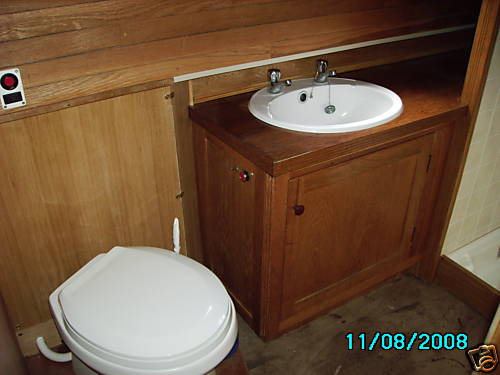 The bathroom has a shower, wash basin, obscured window glass, and an electric flush macerator toilet to a large stainless steel holding tank mounted under the double bed. A standard pump out fitting is provided. Also under the double bed is an insulated double coil calorifier, heated by the central heating and by the engine and with an additional immersion heater. There is sufficient hot water storage for 2 people to shower consecutively with comfort.